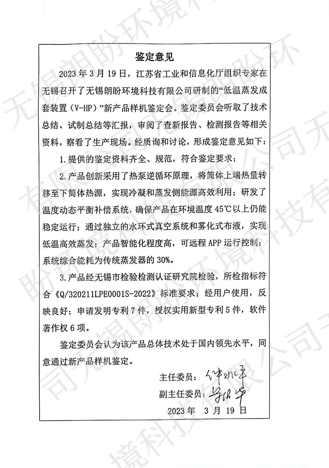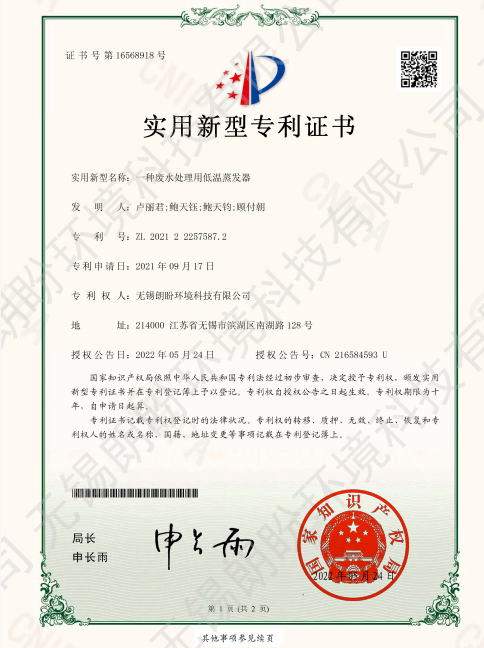無錫朗盼環(huán)境科技有限公司是一家集研發(fā)、生產(chǎn)、銷售為一體的高新技術(shù)公司。主要生產(chǎn)低溫?zé)岜谜婵照舭l(fā)器和結(jié)晶器等污水處理設(shè)備、以高濃高鹽廢水蒸發(fā)處理、液態(tài)危險(xiǎn)廢棄物濃縮減量和物料資 源化回收為主營(yíng)業(yè)務(wù),為客戶提供工業(yè)污水零排放低溫蒸發(fā)技術(shù)整 體解決方案。公司積極響應(yīng)國(guó)家號(hào)召,秉承著“綠色環(huán)保,節(jié)能 減排”的企業(yè)愿景,全力推動(dòng)企業(yè)向科技創(chuàng)新、品牌創(chuàng)新的方向發(fā)展 是國(guó)內(nèi)第一家研發(fā)、制造低溫熱泵蒸發(fā)器、第一個(gè)申請(qǐng)發(fā)明專利的廠 家。并取得多項(xiàng)國(guó)家發(fā)明、實(shí)用專利及軟著證書40余項(xiàng)及江蘇省工業(yè)與信息化廳新技術(shù)新產(chǎn)品認(rèn)定證書。