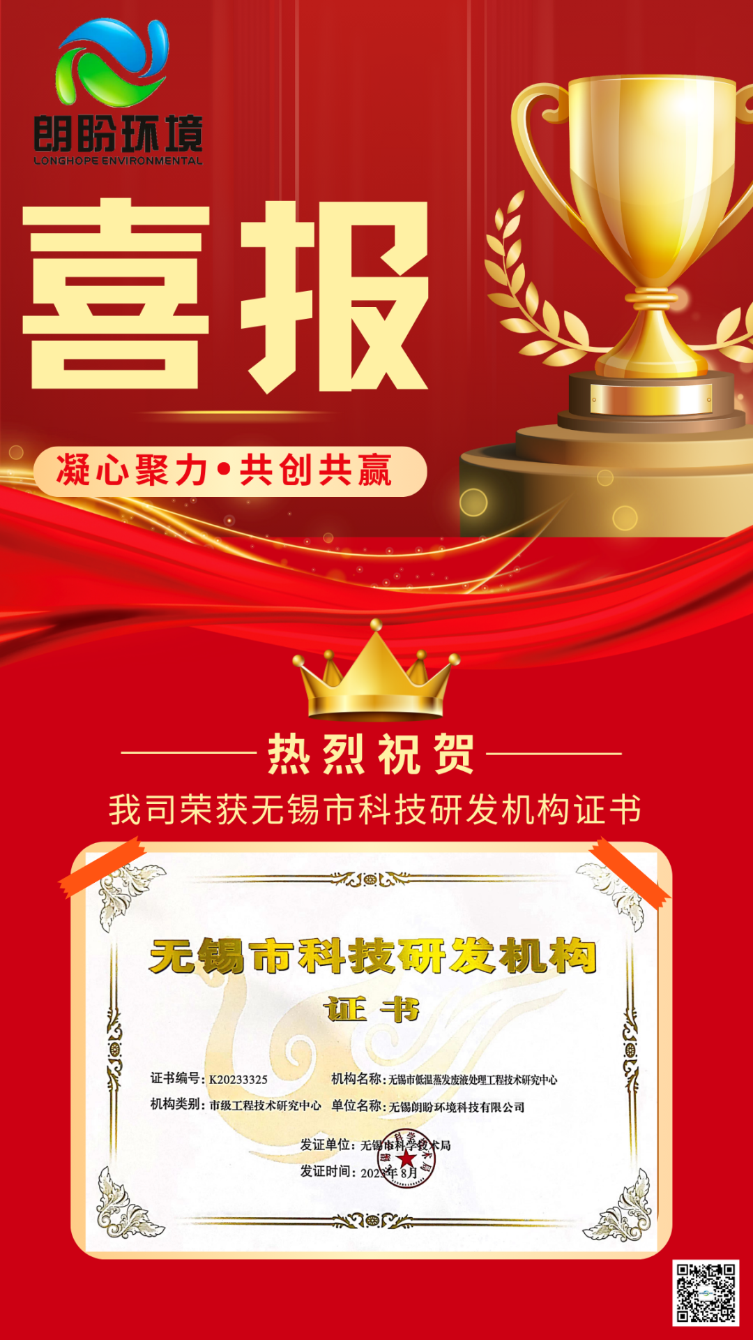 朗盼喜報(bào)!熱烈祝賀我司榮獲無(wú)錫市科技研發(fā)機(jī)構(gòu)證書!