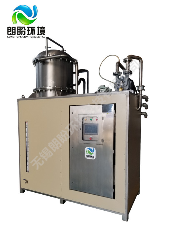 低溫蒸發(fā)結(jié)晶器的原理是物料的沸點(diǎn)隨著壓強(qiáng)的降低而降低。低溫節(jié)能濃縮設(shè)備整體保持真空狀態(tài),蒸發(fā)室的真空度約為95%~97%,在此壓強(qiáng)下水的沸點(diǎn)為35℃~37℃,系統(tǒng)無(wú)需配備進(jìn)料泵,利用蒸發(fā)室的負(fù)壓將物料吸進(jìn)蒸發(fā)室,通過(guò)強(qiáng)制循環(huán)方式將物料循環(huán)霧化,傳輸至換熱器上,物料中水分被蒸發(fā),物料連續(xù)循環(huán)霧化,通過(guò)蒸發(fā)室液位自動(dòng)補(bǔ)料,濃度達(dá)到要求后作為濃縮液排出設(shè)備。濃縮液一般粘度較大,需采用泵抽出。