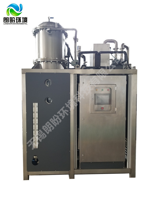 低溫節(jié)能濃縮設(shè)備的原理是物料的沸點(diǎn)隨著壓強(qiáng)的降低而降低。低溫節(jié)能濃縮設(shè)備整體保持真空狀態(tài),濃縮室的真空度約為95%~97%,在此壓強(qiáng)下水的沸點(diǎn)為35℃~37℃,系統(tǒng)無(wú)需配備進(jìn)料泵,利用蒸發(fā)室的負(fù)壓將物料吸進(jìn)蒸發(fā)室,通過(guò)強(qiáng)制循環(huán)方式將物料循環(huán)霧化,傳輸至換熱器上,物料中水分被蒸發(fā),物料連續(xù)循環(huán)霧化,通過(guò)蒸發(fā)室液位自動(dòng)補(bǔ)料,濃度達(dá)到要求后作為濃縮液排出設(shè)備。濃縮液一般粘度較大,需采用泵抽出。